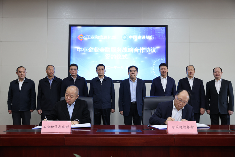 2021年1月5日,为深入贯彻落实党的十九届五中全会和中央经济工作会议精神,推动金融精准服务中小企业,加快构建新发展格局,工业和信息化部与中国建设银行签署《中小企业金融服务战略合作协议》。工业和信息化部党组书记、部长肖亚庆与中国建设银行党委书记、董事长田国立出席签约仪式并座谈。工业和信息化部党组成员、副部长王江平与中国建设银行党委副书记、监事长王永庆分别代表双方签署协议。