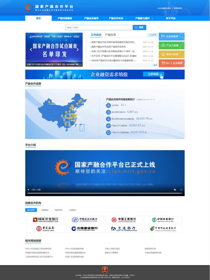 平台以政府部门、行业企业和金融机构为主要服务对象,依托工业和信息化部及相关单位数据资源,运用新一代信息技术手段,开发标签信息管理、融资需求申报、金融产品发布、产融线上对接等功能,推动产融合作政策管理与政务服务线上化、数据分析与信息对接智能化、能力建设与多方合作生态化。自2020年9月平台试运行以来,农业银行、交通银行、光大银行、邮储银行、中国太保、中国东方、国投、中国国新等17家战略合作金融机构已全部入驻并上传金融产品,数千家重点企业入库。截至2月5日,实现签约授信100笔,融资放款107亿元。